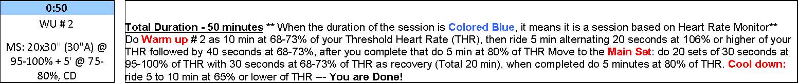 - We won’t do the 1st round of tests until week # 3 for that reason the first few weeks you’ll do the sessions based on RPE or you can use your most recent Threshold Heart Rate (THR), Critical Power (CP), Functional Threshold Power (FTP), etc. and just adjust accordingly. The goal is to easy up into the program and get ready to push down the road so don’t stress much about it during those weeks.